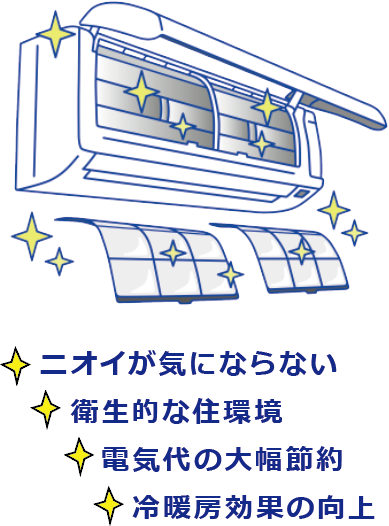 クリーニングをすることでエアコンの内部が清潔になれば、ニオイが気にならないだけでなく、衛生的な住環境になります。カビや汚れがエアコンから噴出していると、空気中にカビの菌などが浮遊している状態なので、吸い込むと肺などに入りアレルギー症状が起きたり、病気の原因になることがあります。